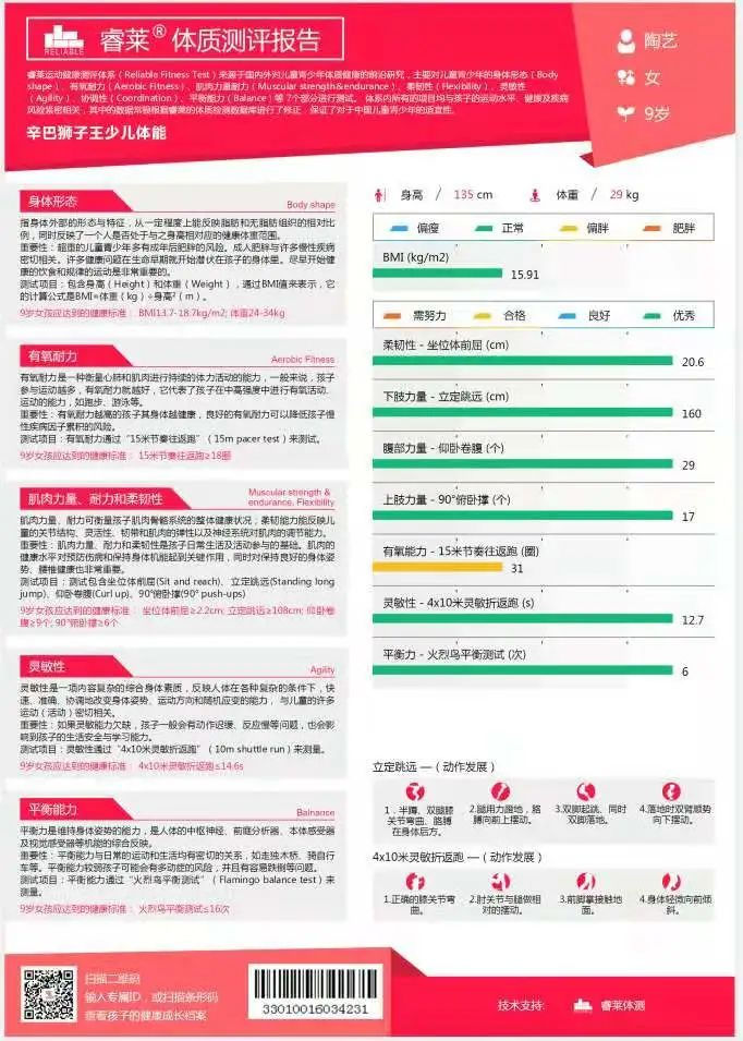 所以我们根据孩子的年龄、身高和体重,还有对应的身体素质的测试项目成绩,有一个很具体的平衡标准。