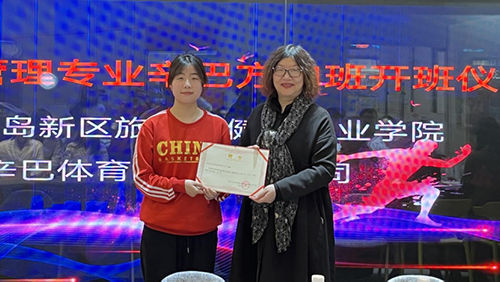 ▲健康学院行政负责人周菊芝对PA视讯体育教练颁发导师聘书